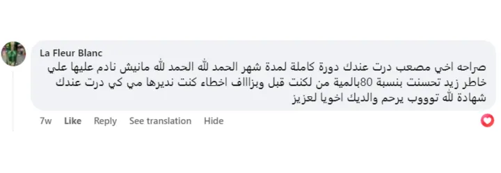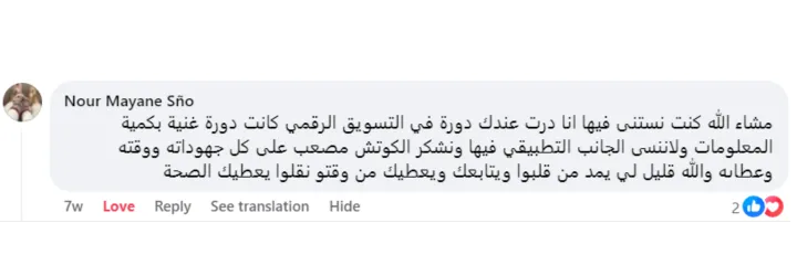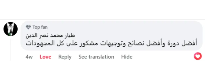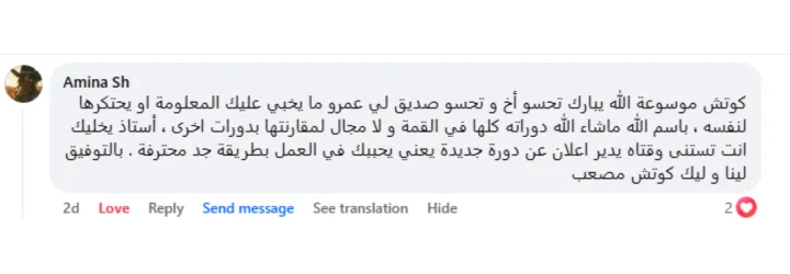 " كوتش موسوعة الله يبارك تحسو أخ و تحسو صديق لي عمرو ما يخبي عليك المعلومة او يحتكرها لنفسه ، باسم الله ماشاء الله دوراته كلها في القمة و لا مجال لمقارنتها بدورات اخرى ، أستاذ يخليك انت تستنى وقتاه يدير اعلان عن دورة جديدة يعني يحببك في العمل بطريقة جد محترفة . بالتوفيق لينا و ليك كوتش مصعب "