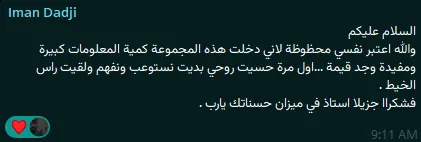 دعم مستمر عبر مجموعة خاصة : بمجرد اشتراكك، ستكون عضواً في مجموعة تيليغرام خاصة بالتدريب تضم المشاركين الآخرين. ستكون هذه المجموعة مكاناً لتبادل المعرفة، الإجابة على استفساراتك، والتواصل مع أشخاص يشتركون معك في نفس الأهداف و الطموحات .